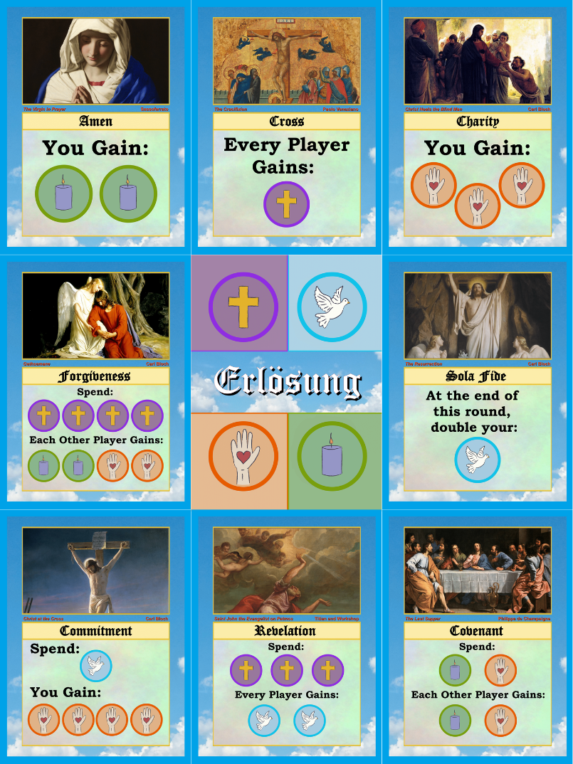 Erlösung is a cooperative game for 2-4 players, based on classical Christian art and philosophy. Each round, everyone reveals their one played card at the same time, with a limited amount of rounds based on the number of players. Once the rounds are over, determine your final group score based on how many goals were achieved amongst all players.
