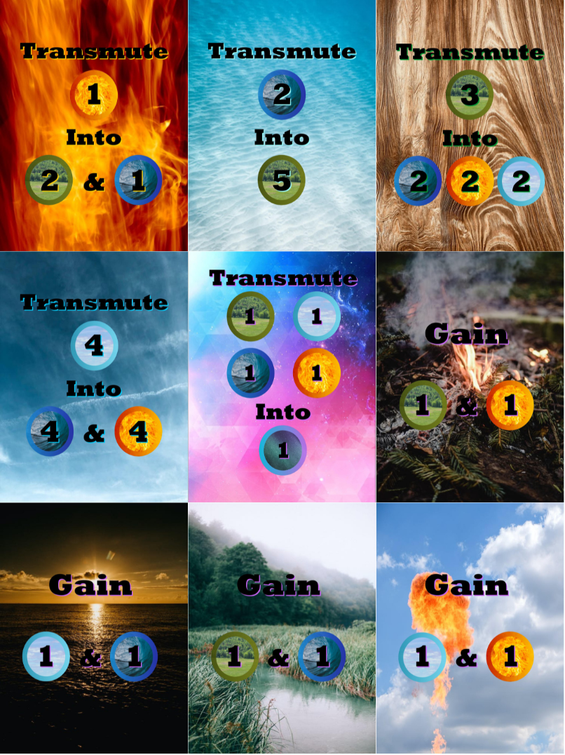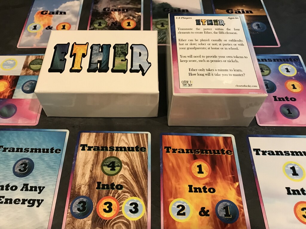 The first player to reach the target amount of Ether wins - but you can change the target depending on how long you want the game to be. Each round, you'll play one card - at which point your turn is over, but then you can discard as many cards as you like and draw your hand back to full before it's your turn again (this keeps the game moving fast!) Your cards will either have you gain elemental power, spend elemental power for an effect, or transmute elemental power to gain more power or gain an Ether. It's that simple - but it still takes skill to find and use the best strategies.