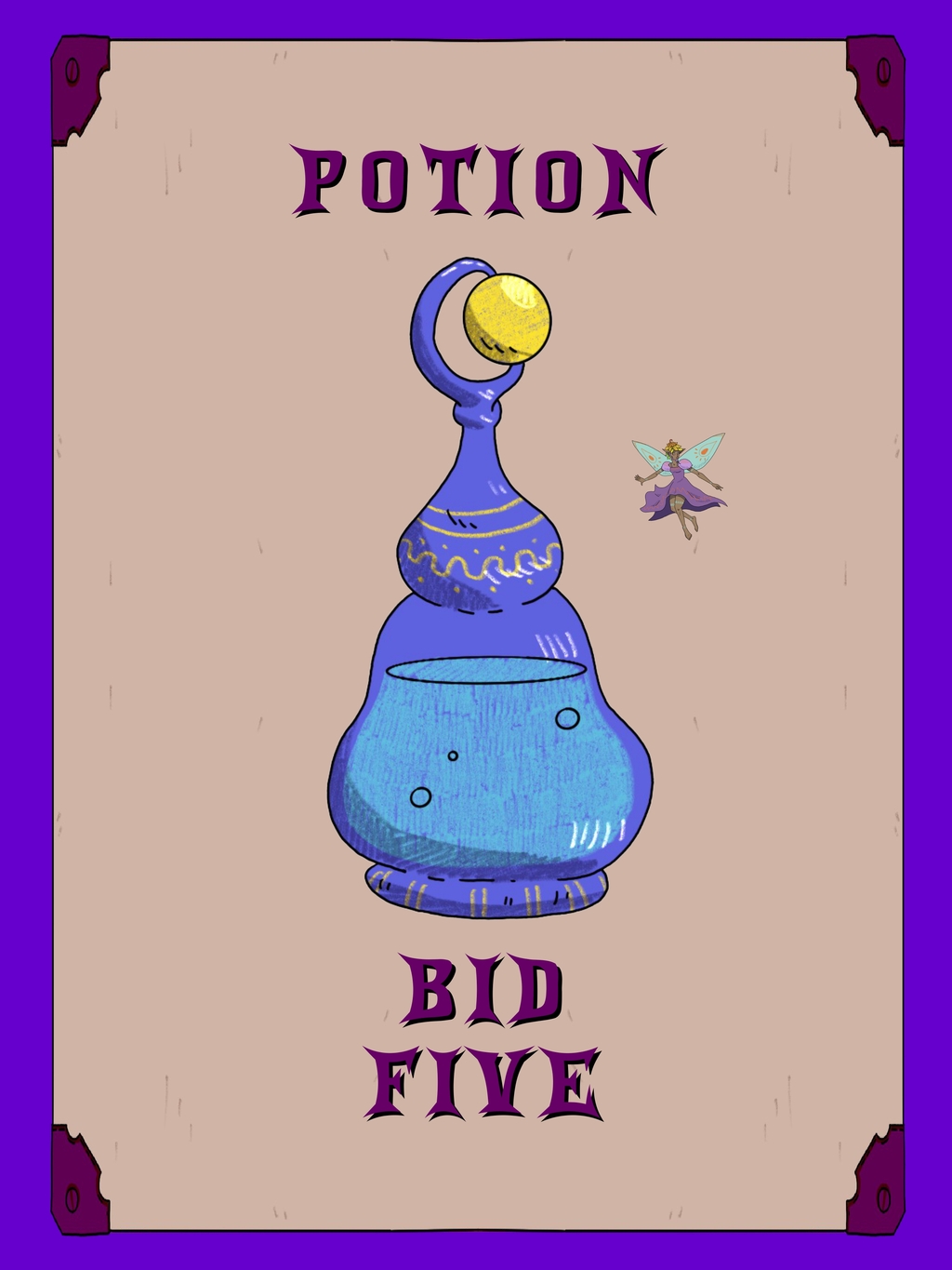 In this game, each player takes on the role of a faerie, and you've all found a cache of treasure that you need to share. However, you know that most of the items are cursed, and so for most rounds you will be trying to place a losing bid! This game lasts for exactly thirteen rounds, at which point the lowest score wins - or you can play for multiple rounds, keeping score, or until a player hits a certain amount of points in total.